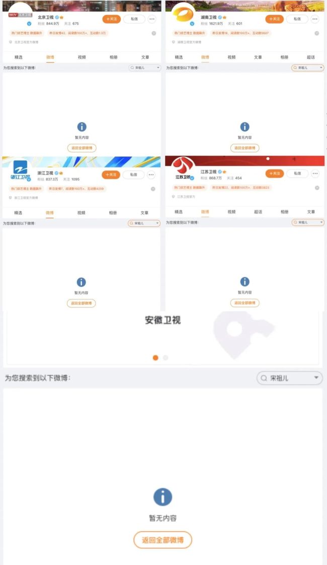 视、江苏卫视、安徽卫视的官方微博查阅北京卫视、湖南卫视、浙江卫知浙江卫视删除宋祖儿动态!,宋祖儿合系实质确已无法搜求到。