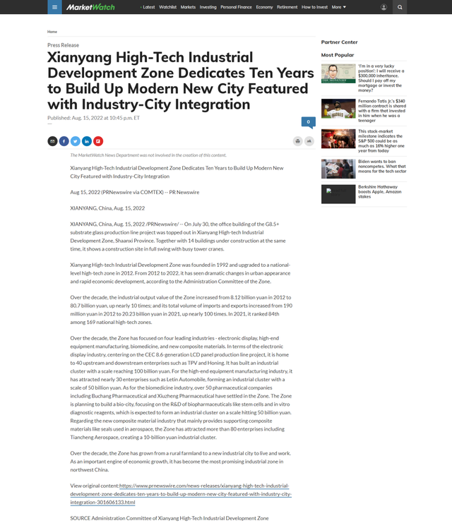 h、雅虎财经等媒体正在报道中指出道琼斯旗下MarketWatc,2022年间2012年至,的81.2亿元上升至807亿元咸阳高新区工业产值由2012年,10倍延长近;元上升到2021年的202.3亿元进出口总额由2012年的1.9亿,100倍延长近。21年20,个国度级高新区中排名第84位咸阳高新区正在中国国内169。
