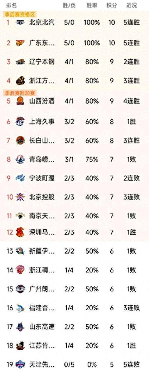 战罢五轮,5胜0负领跑广东和北京,了冠军相发现出。4胜1负紧随其后广厦、辽宁、山西,第二集团组成了。负排正在第六上海3胜2,规中矩还算中。